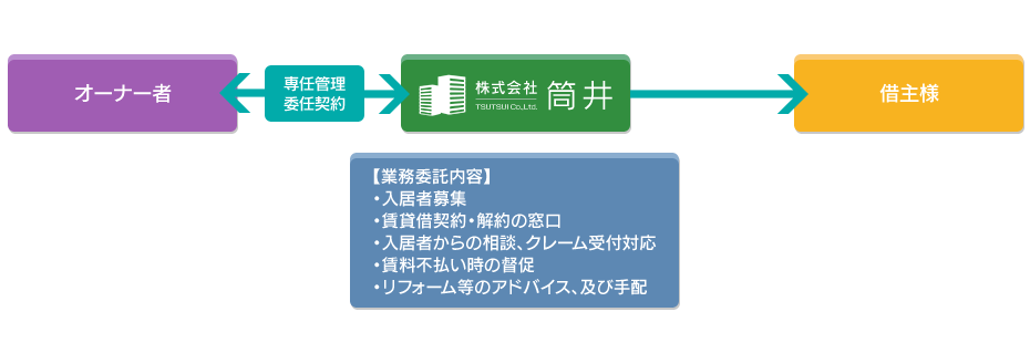 株式会社筒井では、オーナー様からご依頼を受けた賃貸の不動産を代行管理しております。